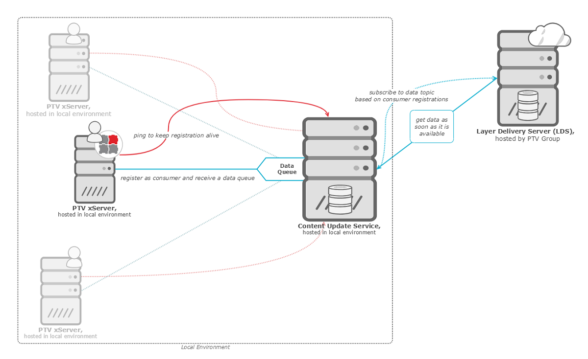 The PTV Content Update Service knows two different ways of communicating with the Layer Delivery Server: subscription to an ActiveMQ topic for required data and polling for new data. None of both mechanisms affects the way data is transferred from the PTV Content Update Service to the xServer.