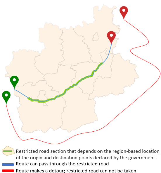 Example | Behavior of a restricted road that depends on the region-based location of the origin and destination points