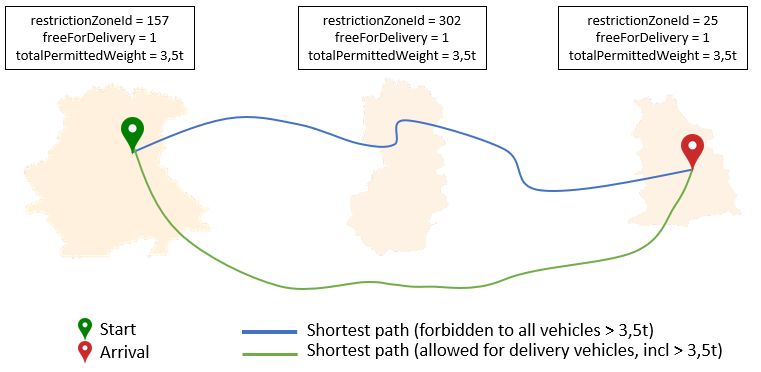 The layer can also handle restricted road sections that depend on the region-based location of the origin and destination points. This kind of restriction is mainly used in Austria where some roads can only be taken for specific vehicle types depending on their waypoint location. In order to be able to take the restricted road, at least the origin and/or destination points have to be located in a specific region declared by the government.