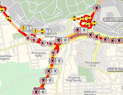 Additional Feature Layer data can not only be used by the PTV xRoute service in route calculation, but it is also possible to visualize this additional data via PTV xMap service on the map. To emphasize the calculated routing result by visualizing the relevant information on the map, the technology allows the definition of different individual and configurable rendering styles for each Feature Layer theme. Defining country dependent styles and filters are also possible.