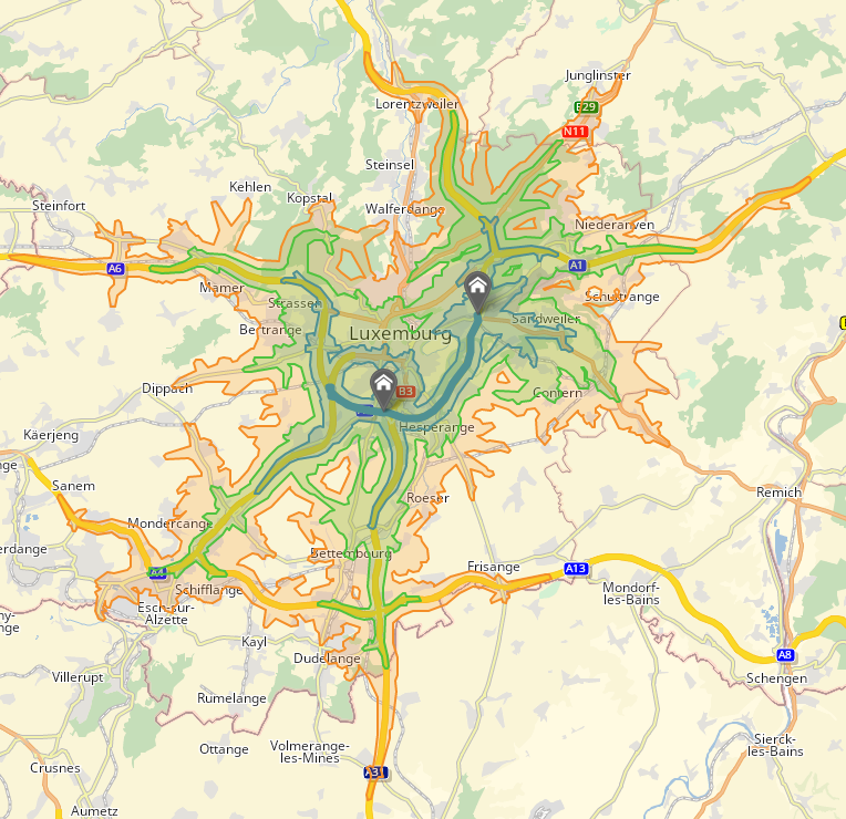 Visualisation of a reachableAreasResponse with 3 horizons in Luxemburg requesting polygons