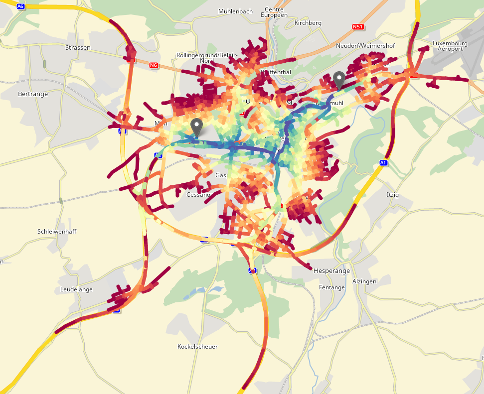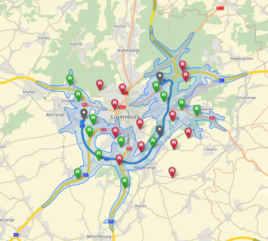 Visualisation of a reachableLocationsResponse on corridor search in Luxemburg