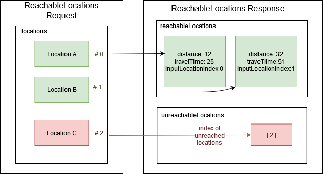 The xRoute function calculateReachableLocations calculates whether one or more locations can be reached from a waypointClosed A waypoint is a geographic location used to specify start, destination and possible stopovers for a route. or from a routeClosed A route corresponds to a path of a vehicle through the underlying transport network. The main attributes of a route are the distance and the time that the vehicle travels along the path. (or the other way around: route reachable from locations).