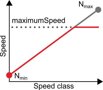 Nmin  and Nmax  correspond to the minimum and maximum speed configured for the network class. While these speeds are usually reached at the lowest or respectively highest speed class they both are limited by the configured maximum speed. In the graph above this results in Nmax for the network class not being reached even on the highest speed class.