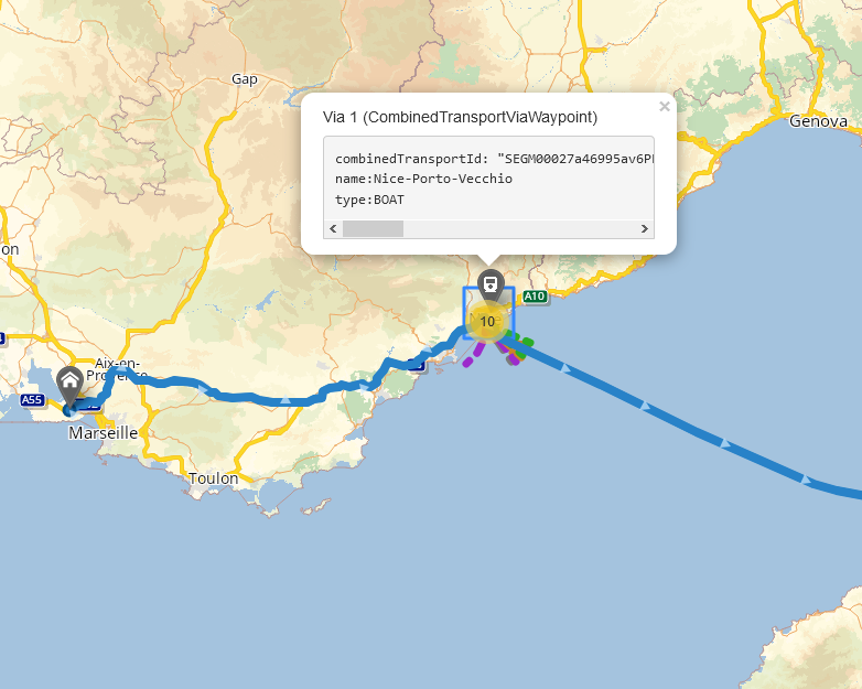 The route takes the specified combined transport The combined transport is a form of transport where the vehicle in question does not drive itself but is transported by a boat or by rail (piggyback). id. A combinedTransportWaypoint does not add a corresponding waypoint in the response. Moreover, it can't be neither the start or the end of a route, only a via waypoint.