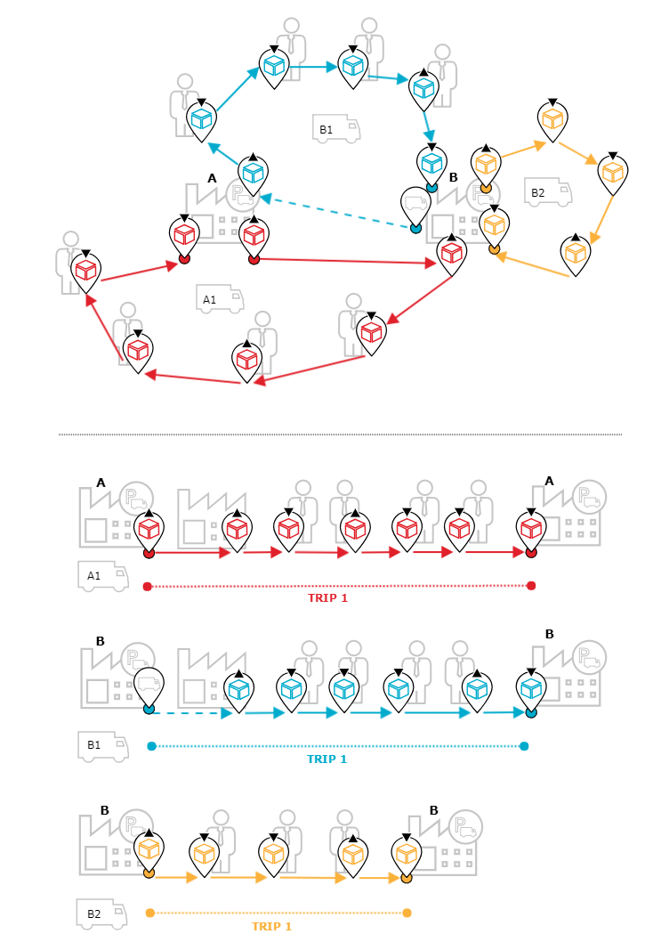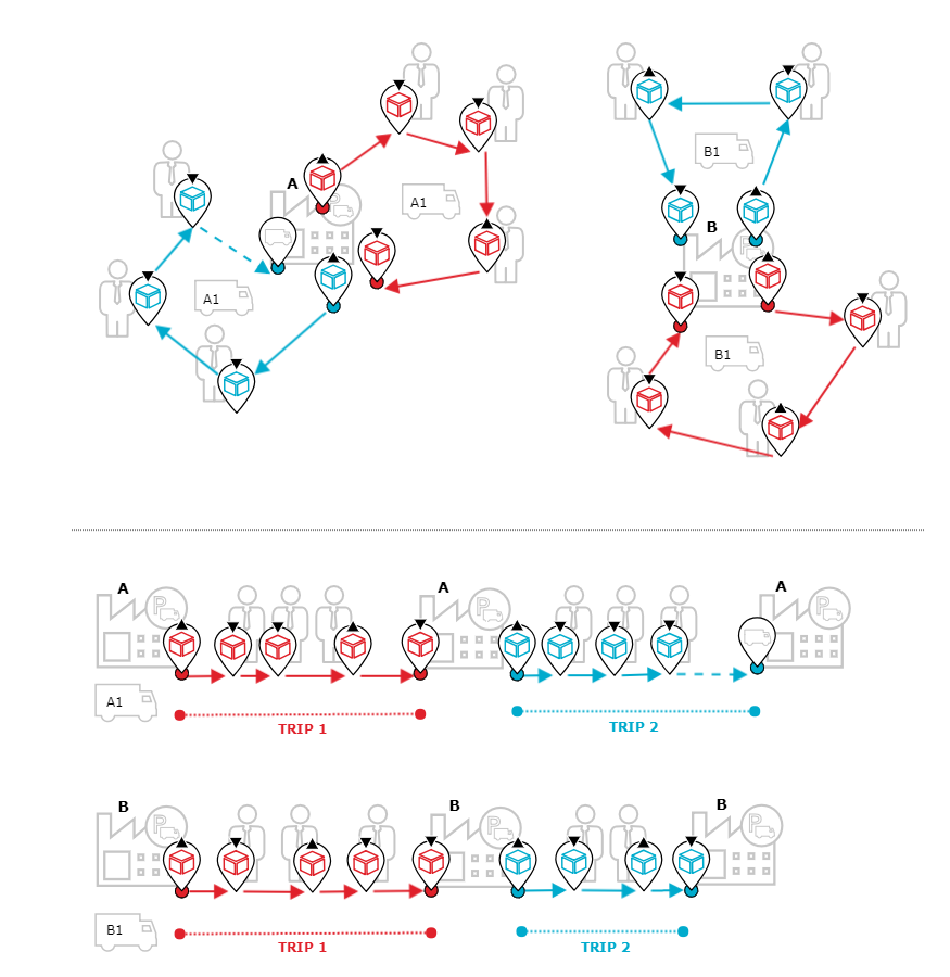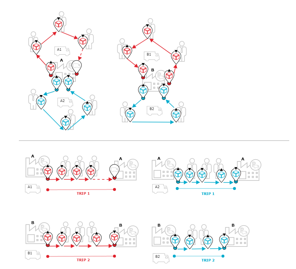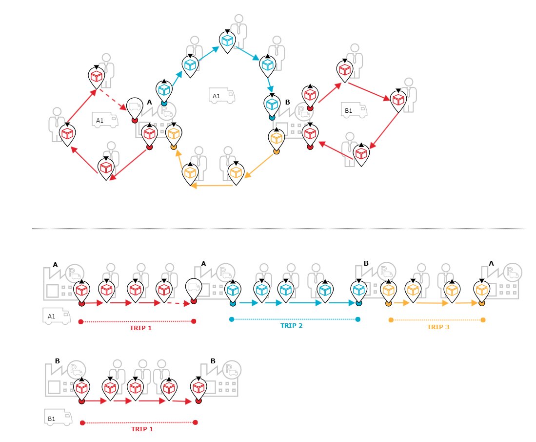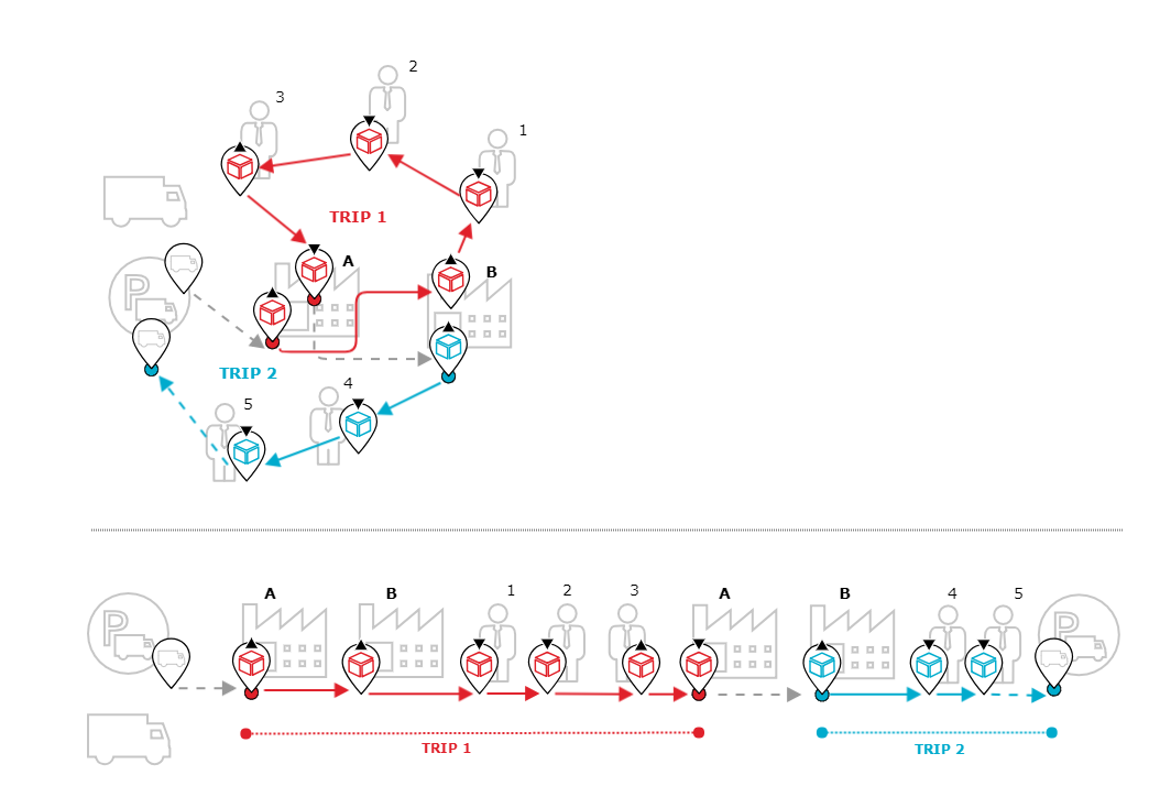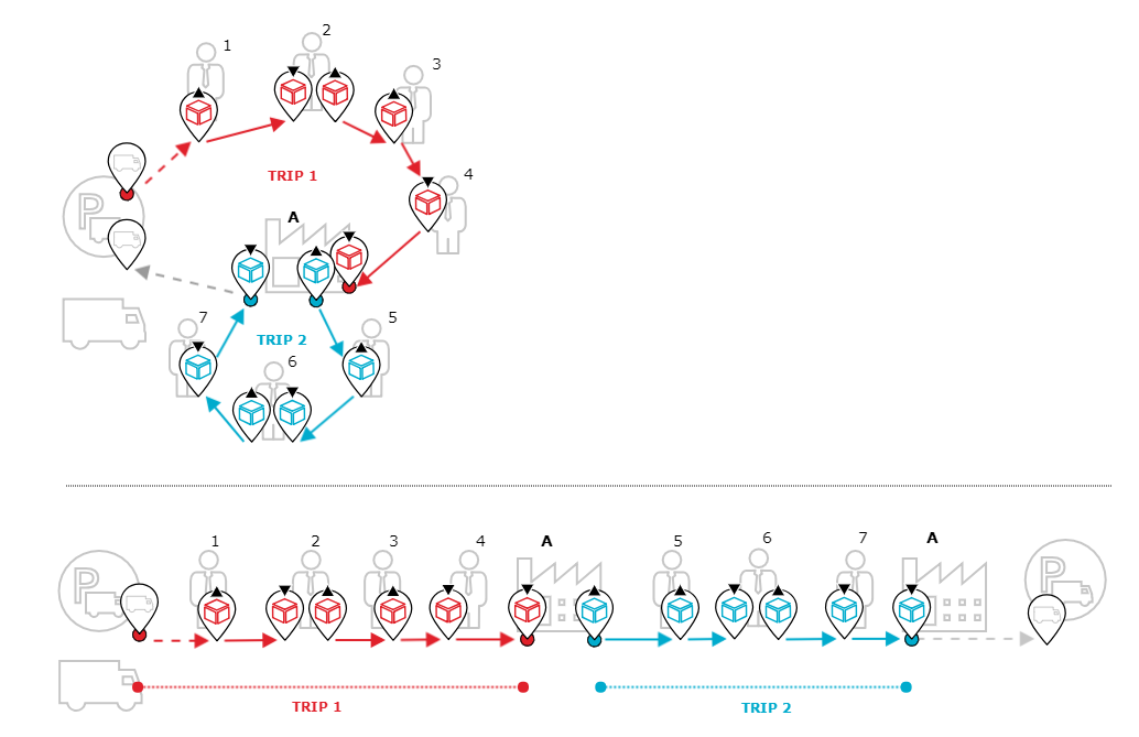 Immediately after that, the second trip starts with the loading of the goods for customers 5,6 and 7. At Customer 6, goods are picked up to be returned to the depot. As soon as these goods are delivered at Depot A, the second trip ends.