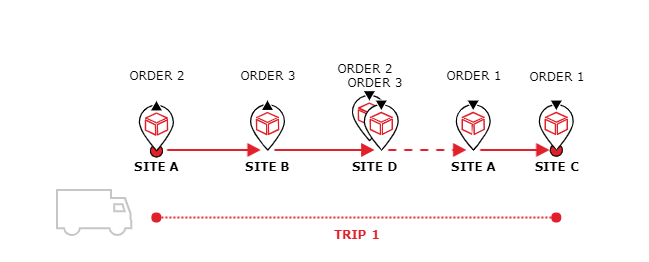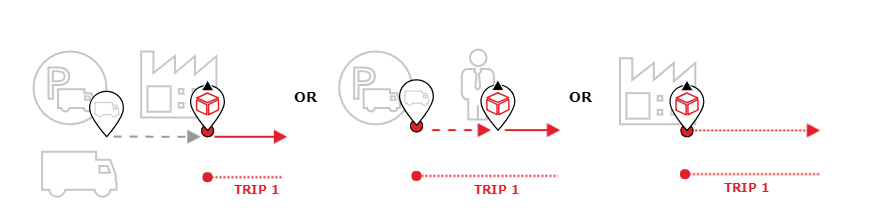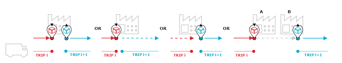 If both pickup and delivery tasks are performed at a depot, the delivery tasks form the last stop of their trip. The first stop of the next trip is formed by the pickup tasks at that depot.