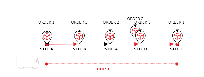 Additionaly, the resulting tour structure is affected by the type of the given sites. Depot sites are subject to a tighter restrictions compared to customer sites. A delivery task at a depot site cannot be followed by any other task than a depot site delivery within the same trip. Otherwise the current trip ends. So, when modelling for example a logistic hub, which is approached multiple times within a trip, using a customer site instead of a depot site would be a feasible solution.